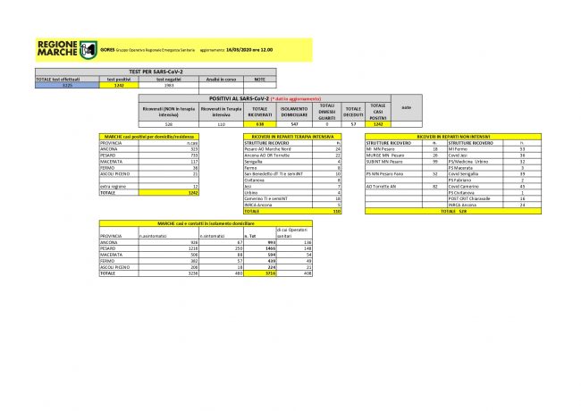 Continua la crescita dei contagiati dal Coronavirus nelle Marche. Il Gores regionale nel bollettino delle 9 ha comunicato i risultati degli esami di laboratorio conclusi nella notte: il numero dei casi è salito a 1.244, più 111 rispetto a ieri. Si tratta della prima piccola frenata legata alla positività dei tamponi dopo giorni di numeri in crescita. Ieri, per esempio, i nuovi casi accertati erano 235. Il totale dei tamponi eseguiti è di 3.194. Per quanto riguarda l’Anconetano, i casi positivi sono 323, 56 in più rispetto a ieri. Pesaro Urbino conta 733 contagi, la provincia di Macerata 117, quella di Fermo 36 e Ascoli 21. Sono 110 le persone ricoverate in terapia intensiva, 528 contagiati si trovano negli altri reparti. L’isolamento domiciliare è tenuto da 3.716 persone: 3.236 sono asintomatiche, 480 mostrano sintomi ricollegabili al Covid-19. Tra gli ‘isolati’ ci sono 408 operatori sanitari. Sono undici le persone morte nella giornata di ieri, che erano ricoverate negli ospedali di Marche Nord, Pesaro e Torrette, 6 uomini e 5 donne tutti residenti in provincia di Pesaro e Urbino e Ancona. Fatta eccezione per una 43enne, una paziente con cuore polmonare cronico ed insufficienza respiratoria restrittiva, l’età delle persone scomparse ieri era compresa tra i 69 e gli 97 anni (tutti con patologie pregresse), per un totale di 57 morti nelle Marche dall’inizio dell’epidemia.