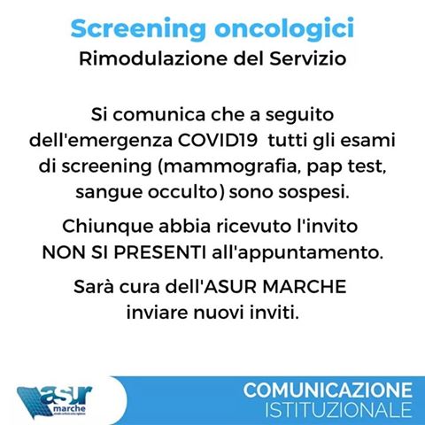 L’azienda sanitaria ha infatti comunicato che tutti gli esami di screening della Mammografia, del Pap test, e del sangue occulto fecale sono in questo momento necessariamente sospesi. «Chiunque abbia ricevuto l’invito, pertanto, non si presenti all’appuntamento. Non appena la situazione lo consentirà, l’Asur provvederà all’invio di nuovi inviti».
