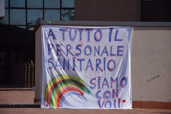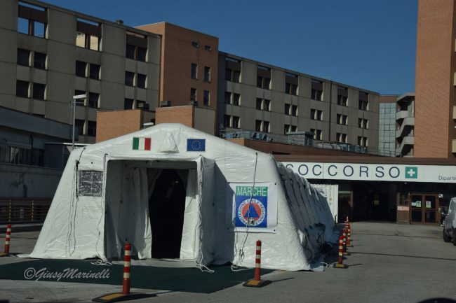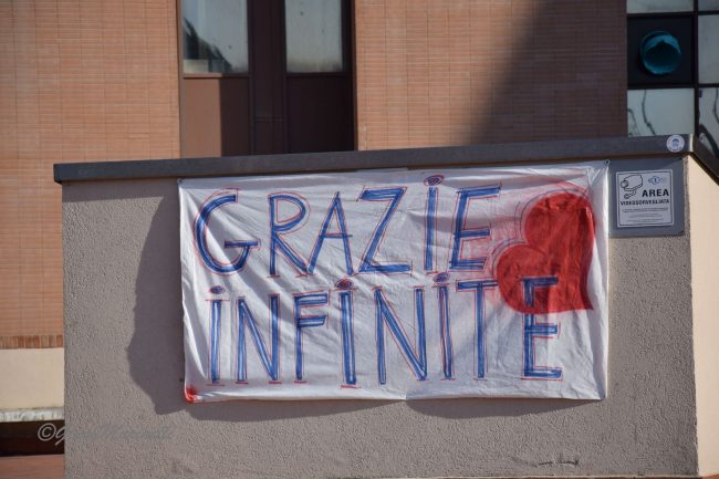“Grazie infinite”, “A tutto il personale sanitario: siamo con voi”. Sono questi i messaggi apparsi sugli striscioni appesi questa mattina all’ingresso dell’ospedale di Torrette. Un supporto a tutti quegli operatori degli Ospedali Riuniti che in questo momento stanno fronteggiando l’emergenza Coronavirus. Intanto, nel parcheggio del pronto soccorso prosegue l’allestimento dei tendoni che ospiteranno i pazienti in attesa dell’esito del tampone. Verranno predisposti 20 posti letto. La fine del montaggio è prevista per domani.