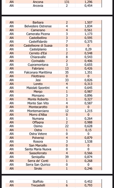 Il Gores ha fornito per la prima volta i dati dei contagi da Coronavirus con una mappa dettagliata delle zone e di tamponi positivi per ogni singolo Comune delle Marche. I dati riguardano pazienti che sono in quarantena nel loro domicilio o ricoverati in una struttura ospedaliera. La situazione più critica nella provincia si registra senza dubbio nel capoluogo: i pazienti positivi al Covid-19 sono 131, seguono Senigallia dove i casi registrati sono 39, Falconara Marittima 35 e Jesi con 33 pazienti positivi. Oggi si è anche registrato il primo decesso all’ospedale Carlo Urbani di un volontario della Croce Rossa di 58 anni. Altre situazioni preoccupanti sono quelle a Osimo (22), Fabriano (13) e Montemarciano (12). Pochi, per fortuna i contagi negli altri comuni: 8 a Chiaravalle; 7 a Castelfidardo; 6 a Trecastelli; 4 a Belvedere Ostrense, a Camerano, Loreto, Maiolati Spontini, Monte San Vito, Polverigi e Sassoferrato. Tre a Camerata Picena, a Castelbellino, Cupramontana, Monsano, Rosora. Sono solo 2 i tamponi positivi registrati nei comuni di Arcevia, Barbara, Cerreto d’Esi, Corinaldo e Offagna. Quasi indenni Castelplanio, Mergo, Monte Roberto, Numana, Ostra, Serra de’ Conti, Sirolo e Staffolo con 1 solo caso per ogni territorio. (I dati dei singoli Comuni qui)
