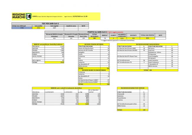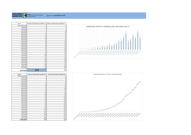 Covid 19, 172 nuovi casi nelle Marche. L’ultimo bollettino del Gores indica una decrescita dei tamponi positivi rispetto a ieri, quando è stato rilevato il maggior numero di nuovi contagi dall’inizio della pandemia. In tutto il territorio regionale, i pazienti trovati positivi al Covid sono 2.153. Nell’Anconetano sono 51 i casi positivi in più rispetto a ieri, per un totale di 564 contagi. La provincia più colpita è Pesaro Urbino con 1.186 casi, Macerata ne ha 238, Fermo 82 e Ascoli Piceno 50. In isolamento domiciliare si trovano 5.364 persone, di cui 1.282 operatori sanitari, circa il triplo rispetto a ieri, quando erano 446. Solo nella provincia di Pesaro ci sono 994 isolati, tra medici, infermieri e altri operatori. In terapia intensiva ci sono 141 persone (3 più di ieri) e nelle aree sub intensive i ricoveri sono 128 quando ieri erano 154. Dall’inizio del contagio, sono 54 i dimessi (ora in isolamento domiciliare) e 2 i pazienti guariti, entrambi di Pesaro. I decessi, ieri, hanno raggiunto quota 153.