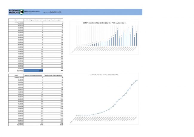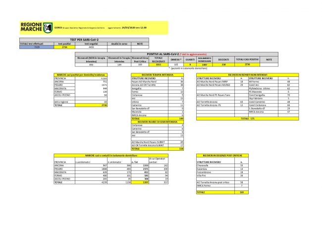 Coronavirus: sono 185 i nuovi casi nelle Marche. Nelle ultime 24 ore, testati 465 campioni. Complessivamente, i contagi nella nostra regione hanno toccato quota 2.736. C’è stato un lieve aumento rispetto a ieri, quando erano stati registrati 130 ulteriori casi positivi, in rapporto però a a 373 tamponi eseguiti. Nell’Anconetano, i nuovi casi sono 49, facendo salire i contagi a 751. Nel Pesarese, i tamponi positivi sono 1.371, nel Maceratese 368, nel Fermano 139 e nell’Ascolano 69. In terapia intensiva ci sono 149 persone. Tra queste, 38 sono ricoverate all’ospedale di Torrette. I ricoveri in aree post critiche sono 169. La quarantena è seguita da 5.397 persone, di cui 557 operatori sanitari. Nell’Anconetano, gli isolati sono 1.333 (162 sono medici, infermieri e oss). Le vittime, con i 28 morti di ieri, sono 230.