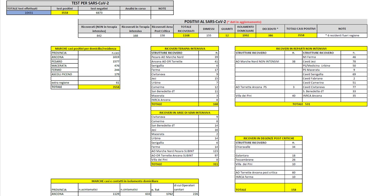 Toccano quota 3.558 i positivi nelle Marche. Dopo le ultime analisi effettuate ieri e comunicate questa mattina dal Gores, il gruppo operativo regionale di emergenza sanitaria, sono stati riscontrati altri 185 positivi su un totale di 547 test effettuati.