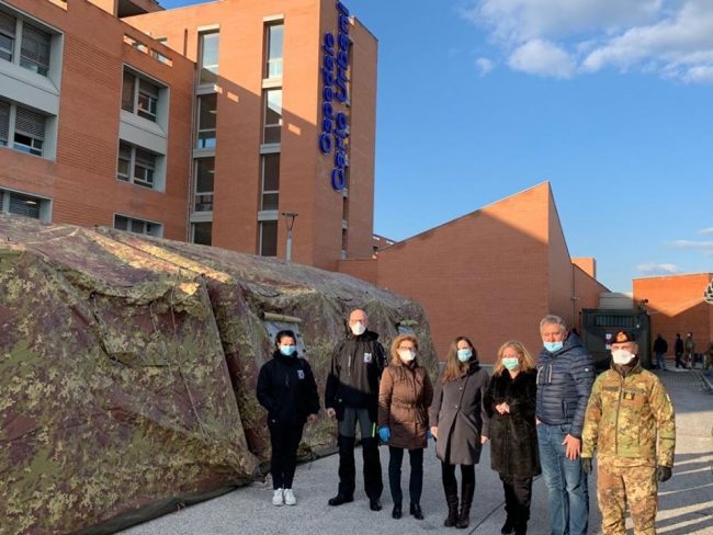 E’ iniziato questo pomeriggio il montaggio dell’ospedale da campo nel piazzale esterno del Carlo Urbani. La struttura sarà gestita dal personale della Marina Militare. Equipaggio e strumenti sono arrivati con una nave partita dal porto di Brindisi e approdata ad Ancona. Ospiterà fino a 44 pazienti. Quattro letti sono riservati alla terapia intensiva. L’ospedale era stato richiesto dal governatore Ceriscioli alla Protezione Civile. Sarà attivo già domani pomeriggio. Gli operatori della Marina saranno seguiti da un pool di medici e rianimatori che il Dipartimento nazionale di Protezione civile ha riservato per la Regione Marche. Ad accogliere il contingente, l’assessora Manuela Bora, insieme con il responsabile del Gores Mario Caroli, con il dg di Asur Nadia Storti, con il direttore di presidio ospedaliero Stefania Mancinelli, con il comandante della Marina Militare Beltrame e con il dirigente della Protezione Civile regionale David Piccinini.