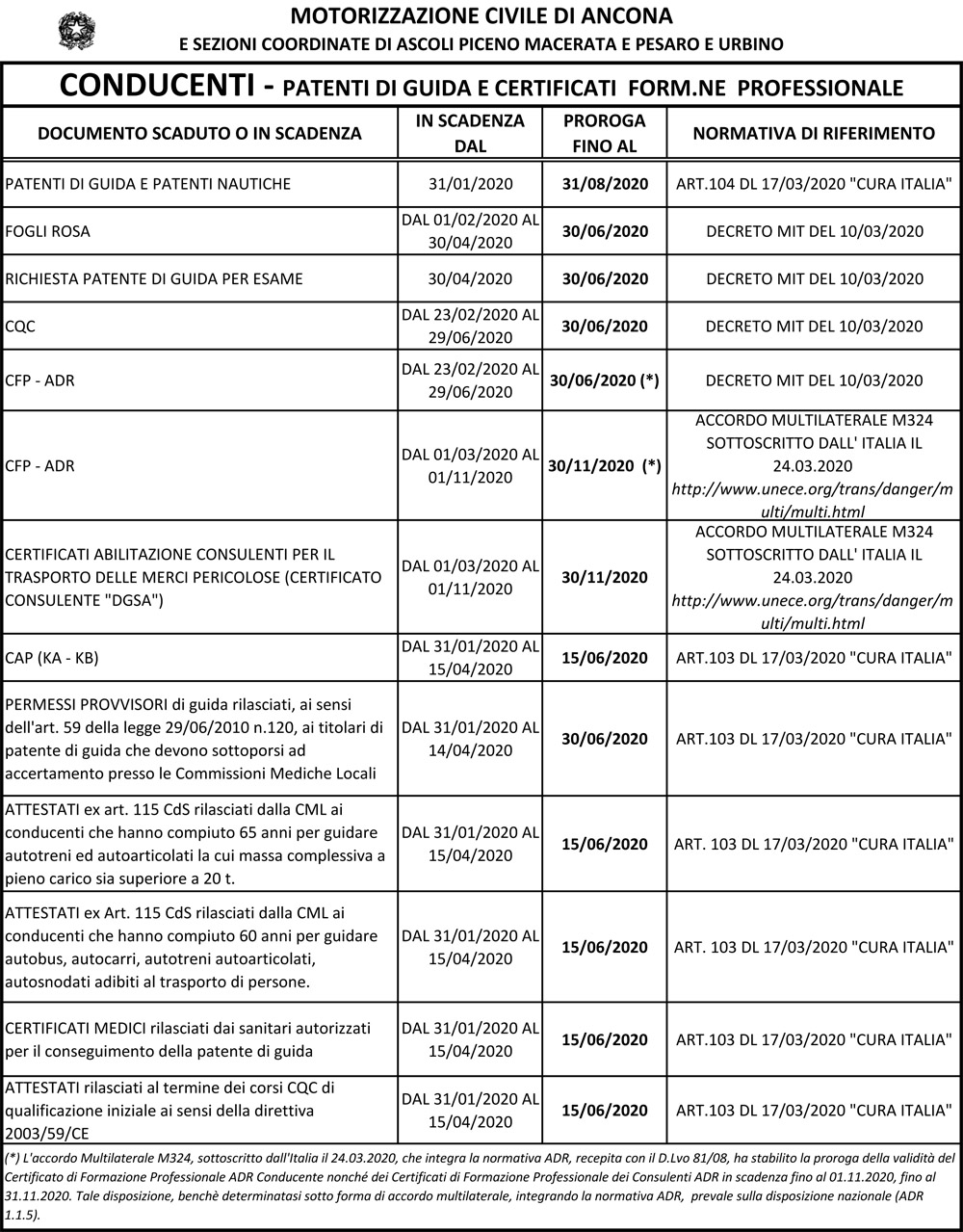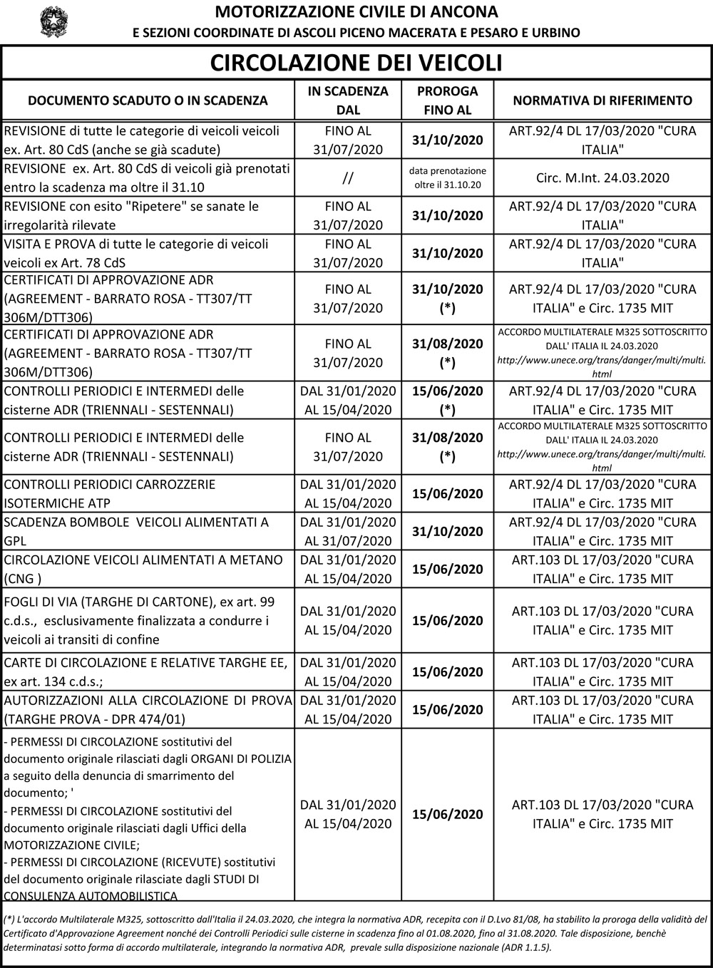 Le diverse le misure inserire nel decreto ‘Cura Italia’ e nei Dpcm precedenti, hanno modificato, in queste settimane di emergenza Covid 19, i tempi per la revisione e pure delle multe e pre la scadenza dei documenti di identità, oltre a sospendere gli esami per le nuove patenti di guida per evitare assembramenti negli uffici pubblici. Fino al 31 ottobre, non ci sarà più nemmeno bisogno di precipitarsi a fare la revisione di auto, moto o motorini: tutte le revisioni che sulla carta di circolazione hanno una scadenza fino al 31 luglio 2020 sono infatti prorogate fino al 31 ottobre. Il decreto allunga poi di 15 giorni, portandolo a un mese, il periodo tra la scadenza dell’Rc Auto e la sottoscrizione della nuova polizza assicurativa. Per semplificare la lettura del decreto, la Motorizzazione civile di Ancona ha inserito le singole misure e voci in una tabella riepilogativa. Le nuove disposizioni prevedono, inoltre, tempi più lunghi per pagare le multe per infrazioni del Codice della strada con lo sconto. Fino a fine maggio chi riceve la notifica di una multa la potrà pagare con lo sconto del 30% entro 30 giorni, anziché gli abituali 5 giorni di tolleranza. la forma di pagamento scontato avrà efficacia dopo la scadenza del periodo di sospensione dai pagamenti, attualmente fissato al 3 aprile (di lì vanno calcolati i 30 giorni). L’agevolazione riguarda i verbali notificati o contestati fino al 31 maggio.