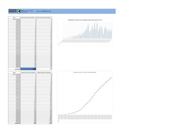 Altri 136 tamponi positivi nelle Marche. E’ l’ultimo dato, in ordine di tempo, fornito dal Gores. Sono 647 i tamponi esaminati. Ieri ne erano stati processati 572. In totale, dall’inizio del contagi, i casi sono 4.098. Nell’Anconetano, i contagi sono 1.211, 37 in più rispetto all’ultima tranche. A Pesaro i casi sono 1.756, a Macerata 533, a Fermo 284 e ad Ascoli 227. In terapia intensiva ci sono 164 persone, quattro in meno di ieri. L’isolamento è seguito da 6.990 persone. Di queste, 1.109 sono operatori sanitari. Ieri si sono registrati 26 decessi: le vittime complessive sono 503.