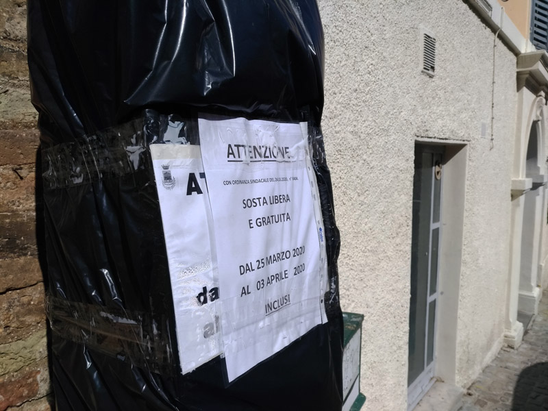 I cartelli affissi sui parcometri del centro storico di Osimo che estendevano la seconda proroga concessa per la sosta libera al 3 aprile 2020