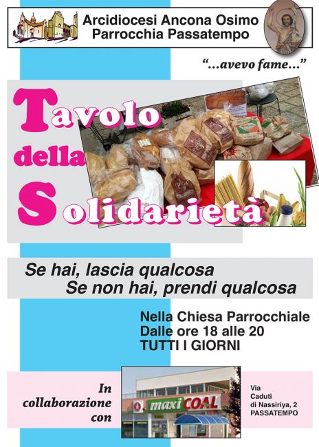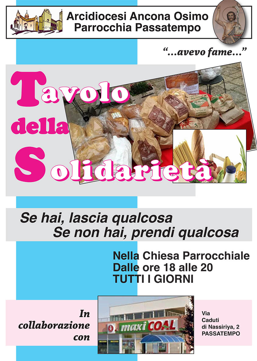Alla gara di solidarietà per aiutare chi si trova in difficoltà economiche in questa momento di emergenza sanitaria partecipa anche la parrocchia “San Giovanni Battista” di Passatempo di Osimo. «In collaborazione con il Maxi Coal locale, – fa sapere una nota ufficiale – si è attivata per organizzare presso i propri locali un tavolo della solidarietà alimentare, aperto tutti i giorni dalle ore 18 alle ore 20. L’iniziativa si caratterizza con la frase ” Se hai, lascia qualcosa. Se non hai, prendi qualcosa” . Le consegne e i prelievi dal banco parrocchiale degli alimentari dovranno essere eseguite nel rigoroso rispetto delle norme igieniche sanitarie, previste in questo periodo di pandemia da coronavirus. La nostra parrocchia, che già nel diciottesimo secolo, si caratterizzava per la presenza di un “Monte Frumentario” di campagna tra i più antichi del comune di Osimo, continua anche oggi la sua missione di sussidiarietà comunitaria».