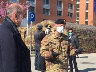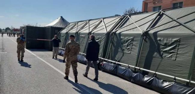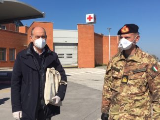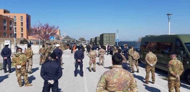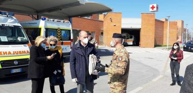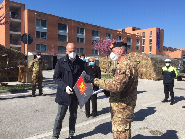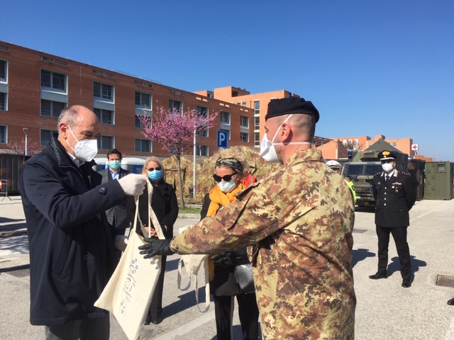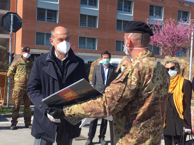 La comunità di Jesi, rappresentata dal sindaco Massimo Bacci, dall’assessore Maria Luisa Quaglieri e dalla consigliera Lindita Elezi ha abbracciato idealmente la Marina Militare, oggi pomeriggio davanti al grande ospedale da campo allestito nel parcheggio del Carlo Urbani di Jesi, che ora assume le fattezze di una cittadella sanitaria. Salutato con l’attenti, il primo cittadino ha incontrato il capitano di vascello Aldo Sciruicchio, comandante del 1° reggimento della brigata marina San Marco e attualmente comandante del dispositivo medico avanzato presente a Jesi. «Un grazie di cuore da parte dell’intera comunità di Jesi e di questo territorio – ha detto Bacci – che vi guardano con grande ammirazione e riconoscenza. Anche psicologicamente è stato molto importante vedervi arrivare e siamo certi che sarete un supporto prezioso allo sforzo straordinario che l’ospedale sta compiendo in questi giorni». Il sindaco Massimo Bacci è salito questo pomeriggio al Carlo Urbani per esprimere alla Marina Militare i sensi di gratitudine per l’ospedale da campo montato in un batter d’occhio, in grado di ospitare oltre 40 posti letto (e forte di un personale sanitario di 70 unità) che offriranno una importante appoggio in questa fase di emergenza.