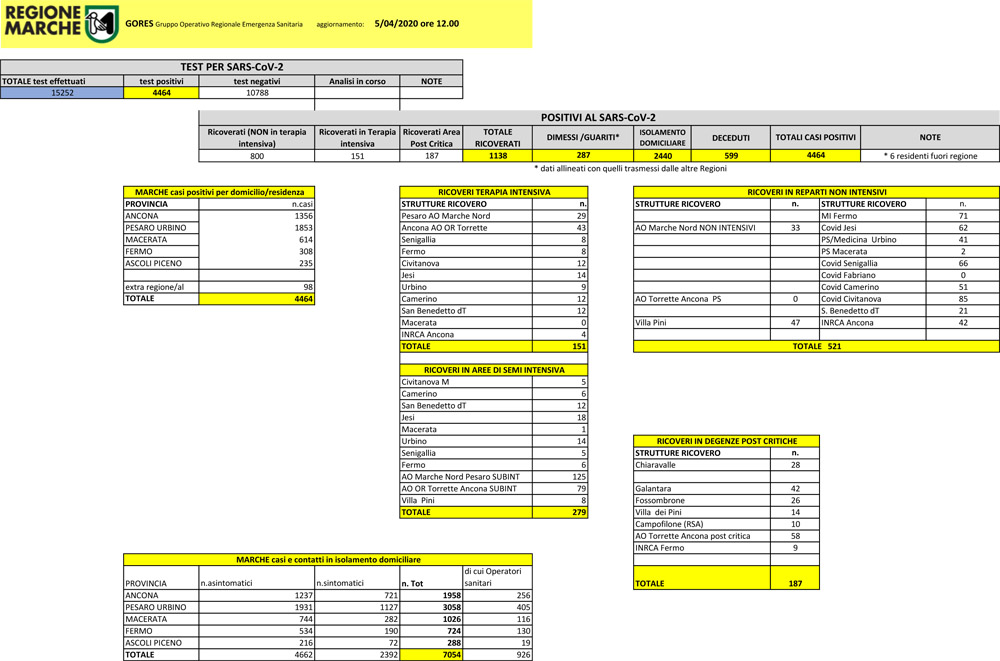Sono 123 i nuovi casi di Coronavirus registrati nelle Marche. Lo comunica il Gores nel bollettino delle 9, dopo l’analisi degli ultimi 780 tamponi effettuate nei laboratori regionali. In totale, quindi il numero dei positivi in regione sale a 4.464 su un totale di 15.252 esami complessivi. Quindi un 29,7% di positivi sul numero complessivo di esami svolto fino ad oggi. Per quanto riguarda il rapporto dei casi positivi sul totale dei tamponi esaminati nelle ultime 24 ore, invece, si tratta di un’incidenza del 15,7%, leggermente più alta di ieri (13,9%).