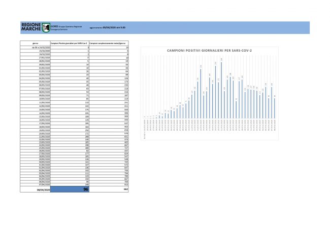 Coronavirus: 96 nuovi casi, 662 i campioni analizzati nelle ultime 24 ore. I contagi complessivi salgono a 4.955. L’incidenza in base all’ultimo bollettino è del 14,5%, ieri era del 16,3%. La settimana scorsa la media era del 18%. Sono 885 le persone che sono guarite o dimesse dagli ospedali marchigiani. Nell’ultimo bollettino erano 645. Stabile il numero dei ricoverati in terapia intensiva: 133. Di questi, 38 si trovano a Torrette. In quarantena, ci sono 7.984 persone, di cui 1.113 operatori sanitari. Per quanto riguarda la provincia di Ancona, i casi totali finora sono 1.481. Ieri erano 1.455.