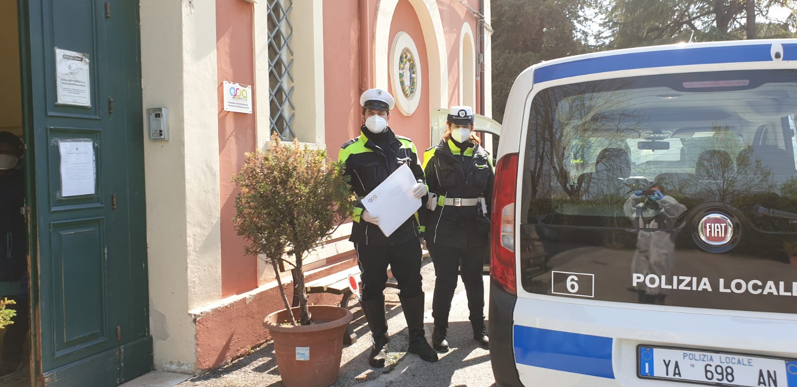 Gli agenti della Polizia locale di Jesi consegnano i primi buoni spesa alimentari alle feamigli che ne hanno fatto richiesta