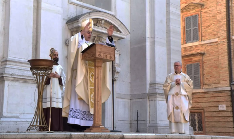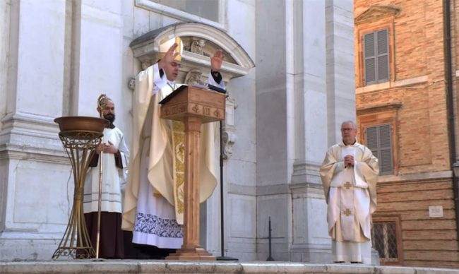 L’arcivescovo delegato pontificio di Loreto, mons, Fabio Dal Cin stamattina in diretta streaming e fb dalla Santa Casa per la messa di Pasqua. E’ seguita la benedizione ai fedeli in una piazza della Madonna deserta