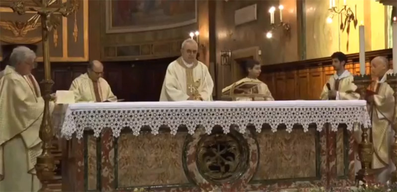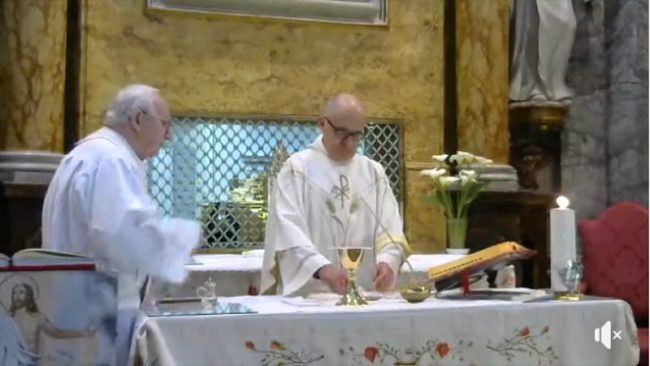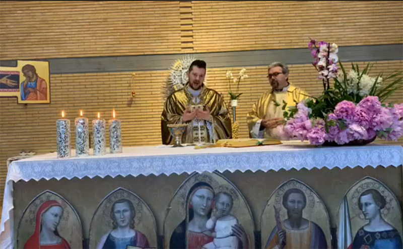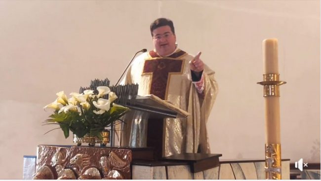 Don Umberto Rotili sull’altare della chiesa della Misericordia di Fabriano, in diretta fb per la messa di Pasqua 2020