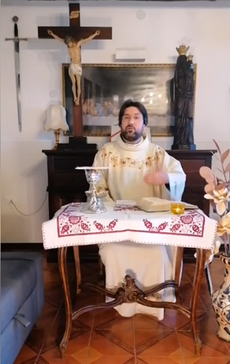 Il sacerdote lauretano don Paolo Volpe in diretta sui social media. Don Paolo ha dato l’input a una raccolta fondi per l’ospedale Santa Casa di Loreto che ha permesso di donare dipsositivi di sicurezza al personale
