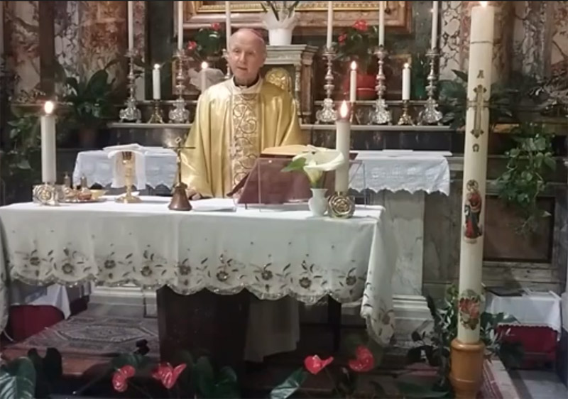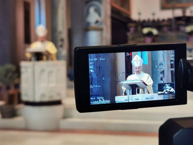 Il vescovo di Senigallia, Franco Manenti, in diretta sui social media per la santa messa di Pasqua dalla cattedrale della città