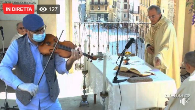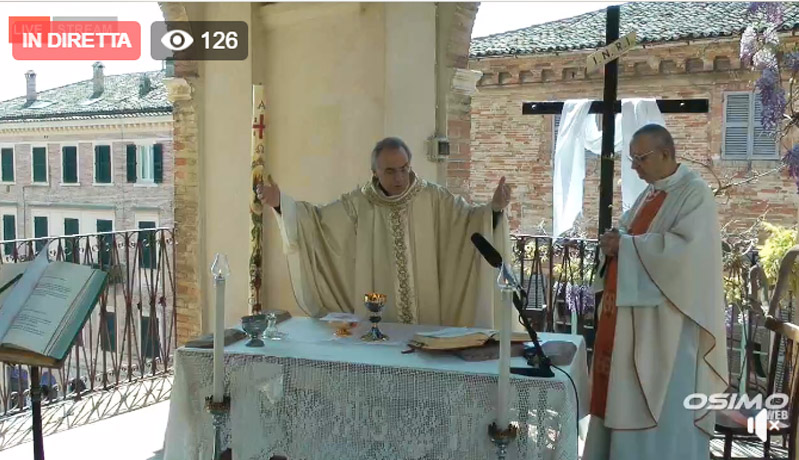 La messa di Pasqua celebrata da don Dino Cecconi, parroco rettore del Duomo di Osimo sulla loggia dell’Episcopio. che si affaccia sulla piazze (deserte) della città La funzione religiosa è stata animata dagli intermezzi musicali del maestro Marco Santini, stamattina in diretta streaming su Osimo web e in filodiffusione per il centro storico. Oggi don Dino festeggiava il 40°anniversario di sacerdozio