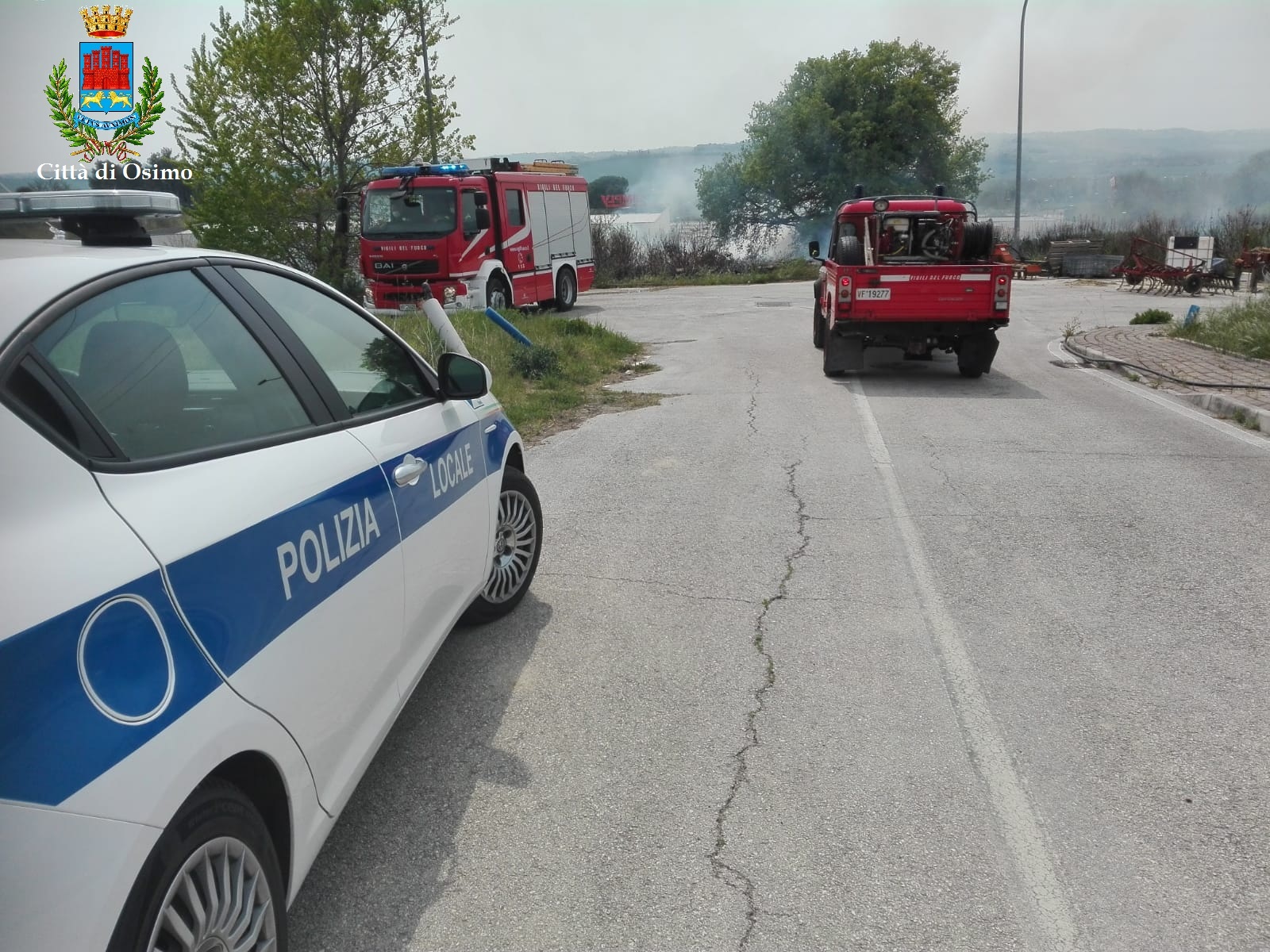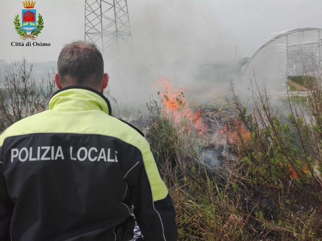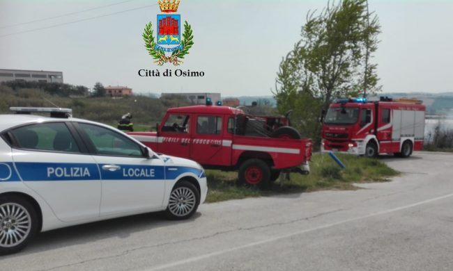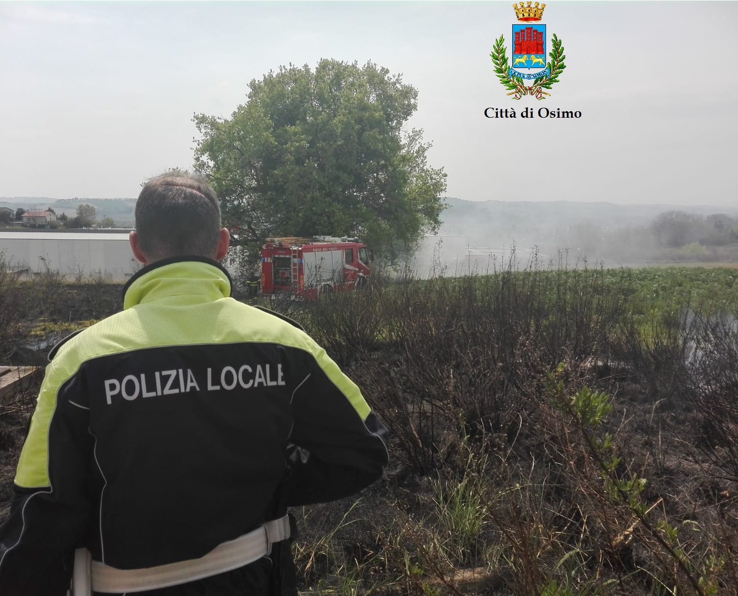 Fumo e fiamme in via Tortora nella tarda mattinata di Pasquetta ad Osimo. Una pattuglia della Polizia locale del Comune di Osimo, intorno alle 13 di oggi, durante il controllo del territorio, nell’ambito del dispositivo di sorveglianza disposto dal Commissariato di Polizia di Stato su richiesta della Prefettura di Ancona, ha notato un’intensa colonna di fumo levarsi al limitare del centro abitato. Gli agenti si sono immediatamente portati alla base delle volute di fumo dove delle sterpaglie stavano ardendo alimentate dalla lieve brezza e dall’erba secca dovuta a questa prolungata fase di bel tempo. Mentre gli agenti sul posto tentavano di sottrarre alle fiamme la maggior quantità possibile di materiale infiammabile come bancali e tubi di gomma accatastati lì vicino, la Centrale operativa di via Molino Mensa ha fatto immediatamente partire la richiesta di attivazione dei vigili del fuoco che hanno fatto intervenire una squadra del distaccamento di Osimo. I vigili del fuoco hanno avuto ragione dell’incendio, che aveva già divorato circa 800 mq di campo, prima che lambisse l’area del centro commerciale “La Coccinella” di via Molino Basso. Non sono ancora chiare le cause  che hanno innescato l’incendio. Non è neppure la prima volta che in questa zona vengono abbandonati rifiuti.