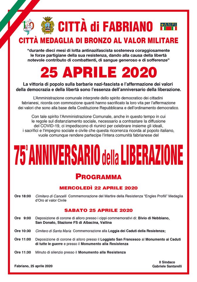 Il Coronavirus non ferma le commemorazioni della Liberazione a Fabriano. Quest’anno la cerimonia sarà social per via del lockdown ma comunque pubblica ed potrà essere seguita in diretta streaming. La città ricorderà quanti hanno sacrificato la propria vita per l’affermazione dei valori che sono alla base della Costituzione dell’ordinamento democratico nel rispetto delle regole sul distanziamento sociale che impediscono gli assembramenti e di far svolgere i cortei.