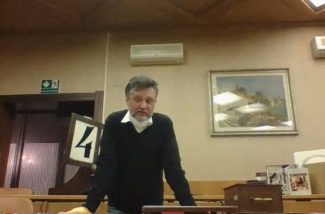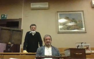 Il sindaco Paolo Niccoletti (sullo sfondo) con l”urlatore’ Giorgio Sbaffo (in primo piano) durante la tombola in diretta facebook di ieri sera
