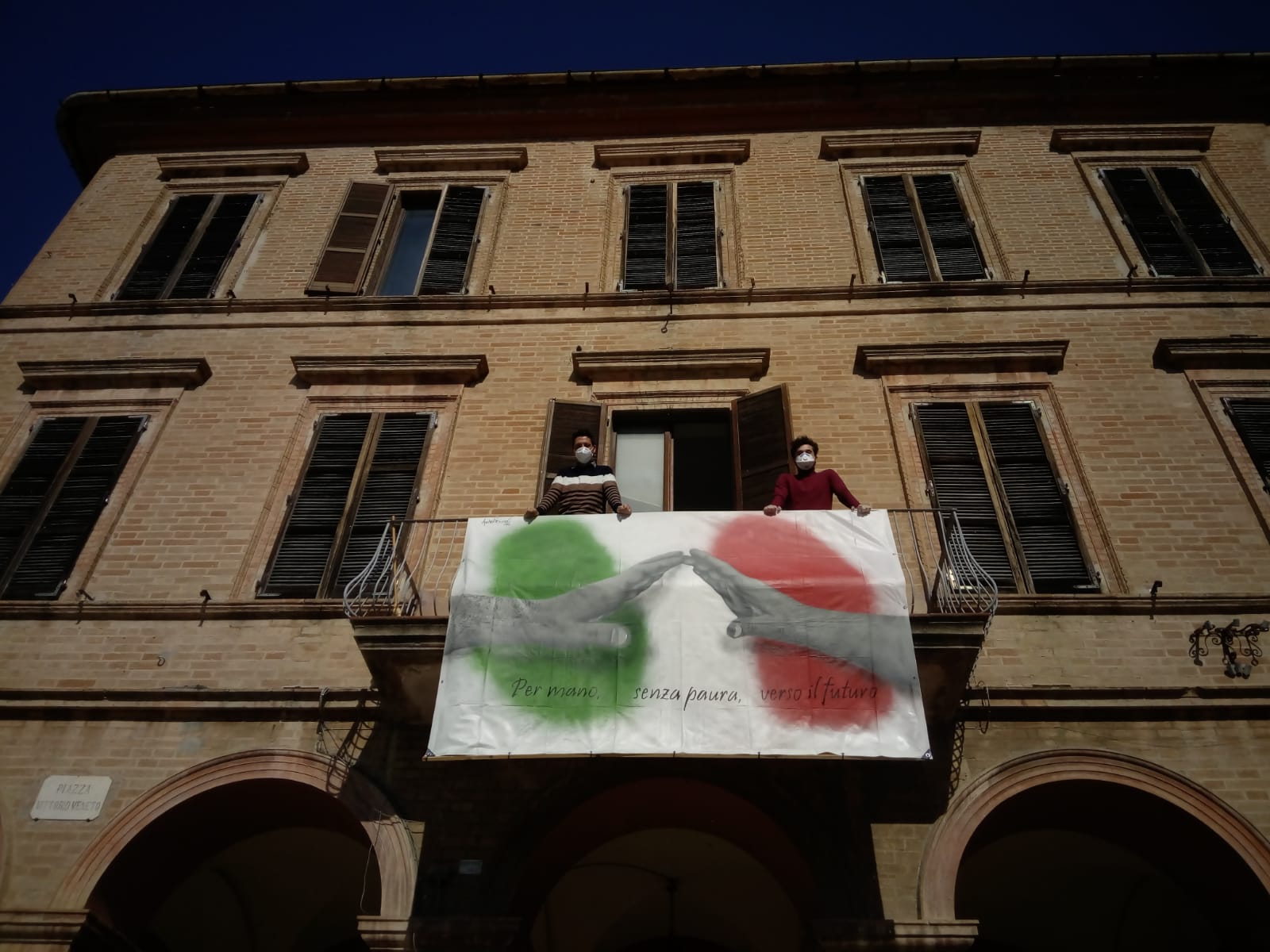 Nella giornata simbolo della Resistenza, l’Amministrazione comunale di Montemarciano ha voluto mandare un messaggio di speranza a tutti i propri concittadini e lo ha fatto affiggendo uno striscione in uno dei palazzi storici del nostro territorio. L’opera è del giovane artista locale Andrea Pesciaioli