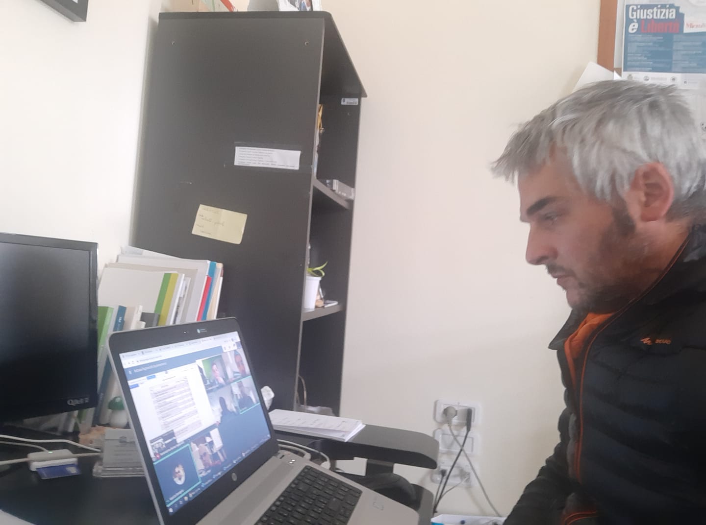 Il sindaco Gabriele Santarelli collegato in videoconferenza con i rappresentanti delle associazioni di categoria del commercio