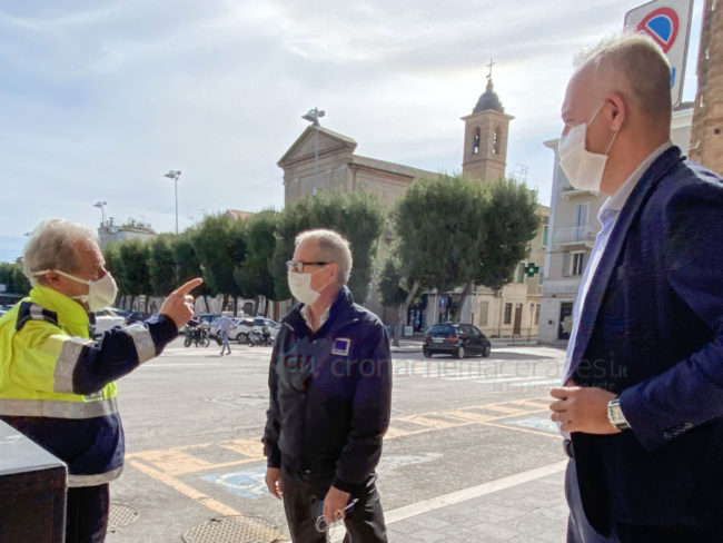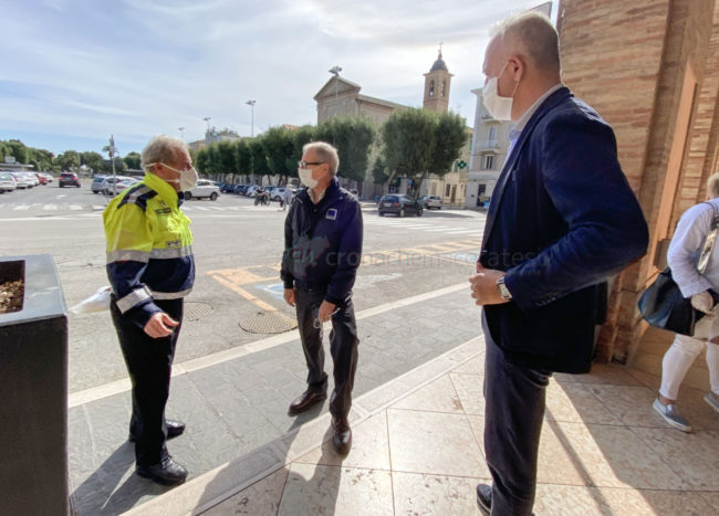 Guido Bertolaso e Fabrizio Ciarapica oggi davanti al Comune di Civitanova (foto De Marco)