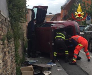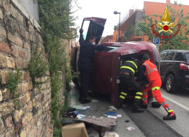 Esce per la prima volta di casa dopo le lunghe settimane di lockdown e, per cause ancora da accertare, si ribalta al volante della sua Grande Punto Fiat in via Cesare Battisti a Castelfidardo.