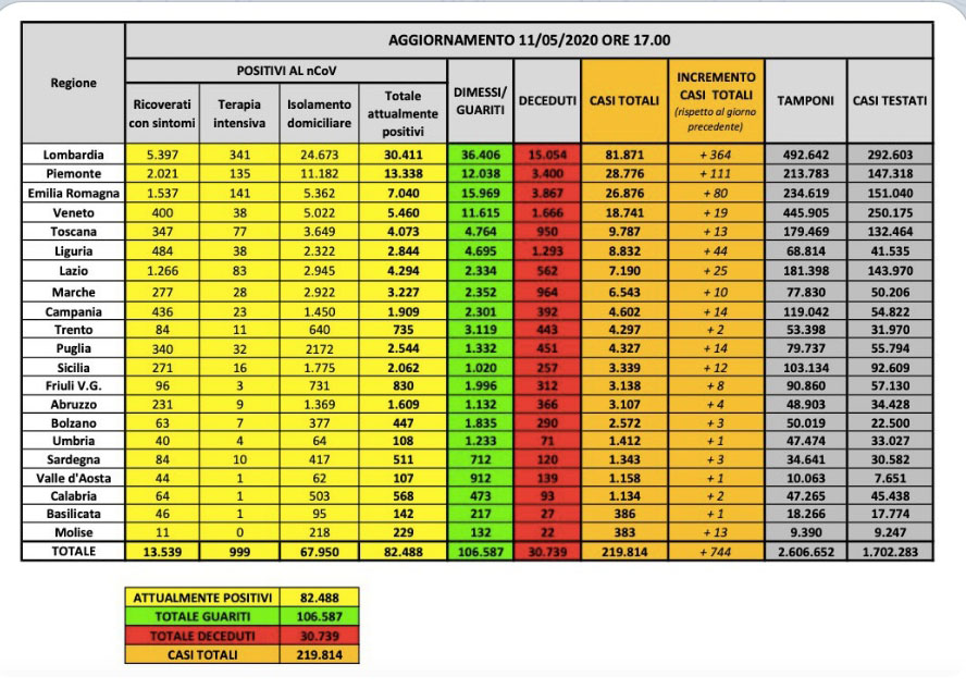 Tre invece erano del Maceratese. Si tratta della 89enne Lina Piersanti, di Morrovalle, e del 75enne di Cingoli, Giuliano Bartolelli. Oltre a loro è scomparso anche un 90enne di Potenza Picena che si trovava ricoverato all’ospedale di Camerino. Oltre a loro sono scompari un 78enne e un 88enne di Pesaro. Nel complesso, dall’inizio dell’emergenza epidemiologica sono 969 i morti nelle Marche, di questi 212 della provincia di Ancona. Nel 94,7% dei casi avevano patologie pregresse e l’età media è di 80,5 anni. In Italia i decessi registrati oggi sono 179 su un totale di 30.739 mentre sono 744 nuovi casi di positività su un totale di 219.814. I dati più bassi registrati nell’arco degli ultimi due mesi. Negli ospedali di tutta la Penisola i pazienti ricoverati in terapia intensiva oggi sono meno di 1000.