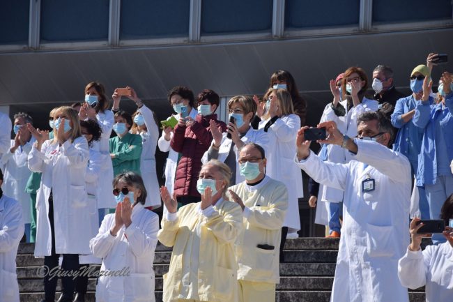 Gli operatori sanitari di Torrette durante l’omaggio delle forze dell’ordine
