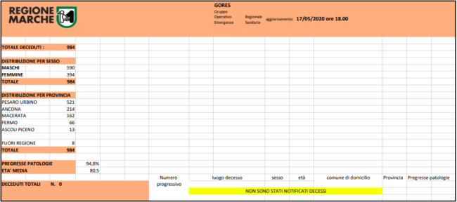 Bollettino quotidiano del Gores, per il primo giorno dal 2 marzo a oggi nessun morto nelle Marche a causa del Covid-19. «Da tante settimane ormai – afferma il presidente Luca Ceriscioli – aspettavamo questo giorno e questa notizia: oggi nelle Marche nessuna persona è deceduta per il Coronavirus. E’ una giornata importante e sono felice di condividere questa notizia con tutti voi, con tutti i cittadini marchigiani, con gli operatori che da mesi sono in prima linea per supportare le persone malate e i più deboli. La battaglia non è finita ma questa buonissima notizia ci aiuta a proseguire nella gestione di questa difficile emergenza. Noi continuiamo a tenere alta la guardia e a lavorare responsabilmente per contenere i contagi, e sono sicuro che continuerete a farlo anche tutti voi, soprattutto in questa delicatissima fase delle riaperture. Questa sera, ancora una volta, il nostro abbraccio più affettuoso va alle famiglie di coloro che hanno perso i loro cari».