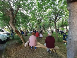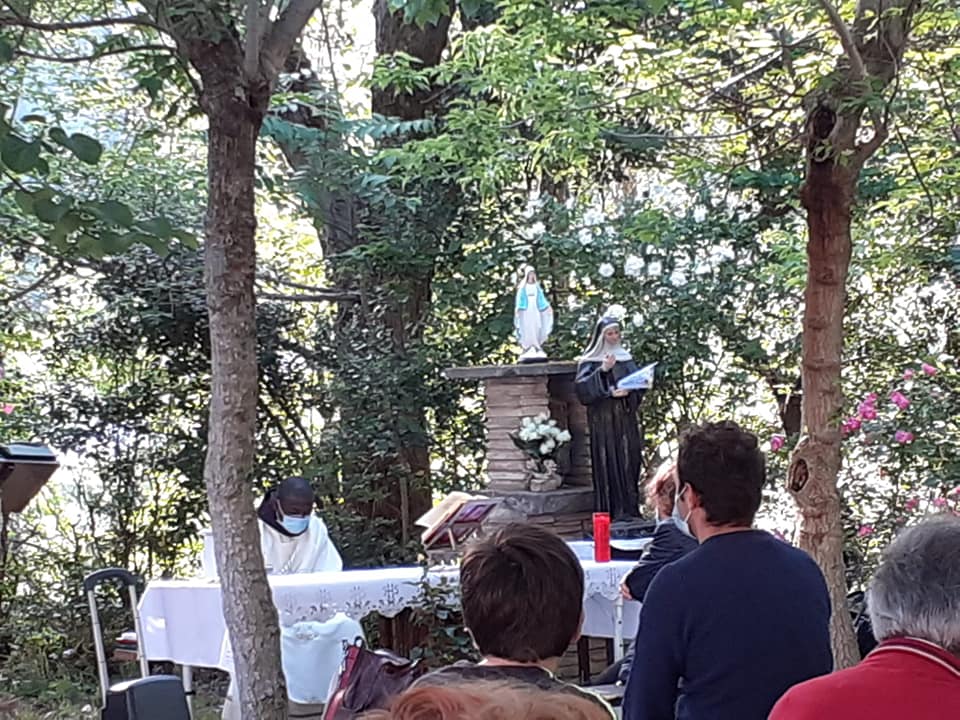 La messa celebrata in giardino nella parrocchia della Misericordia di Osimo (foto Elisabetta Bartolomei)