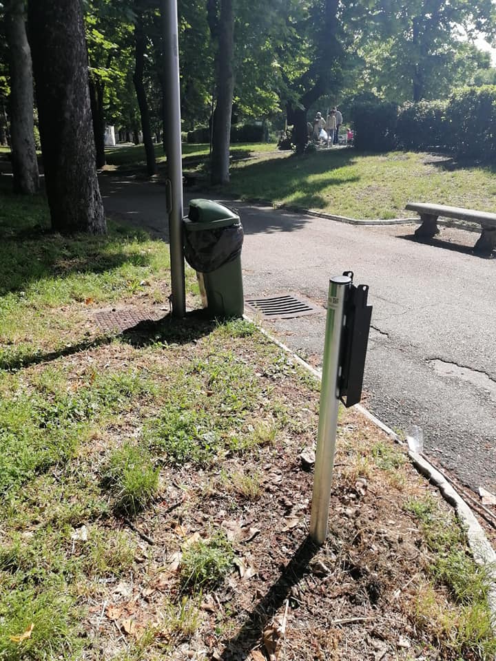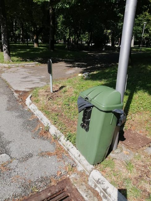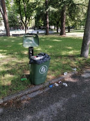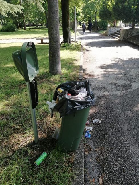 FABRIANO - Gabriele Santarelli pubblica le foto dei cestini dei rifiuti divelti e delle bottiglie di alcolici abbandonate sul'erba nell'area verde del centro storico e bacchetta gli autori. Sui danneggiamenti scoperti stamattina indaga la Polizia locale