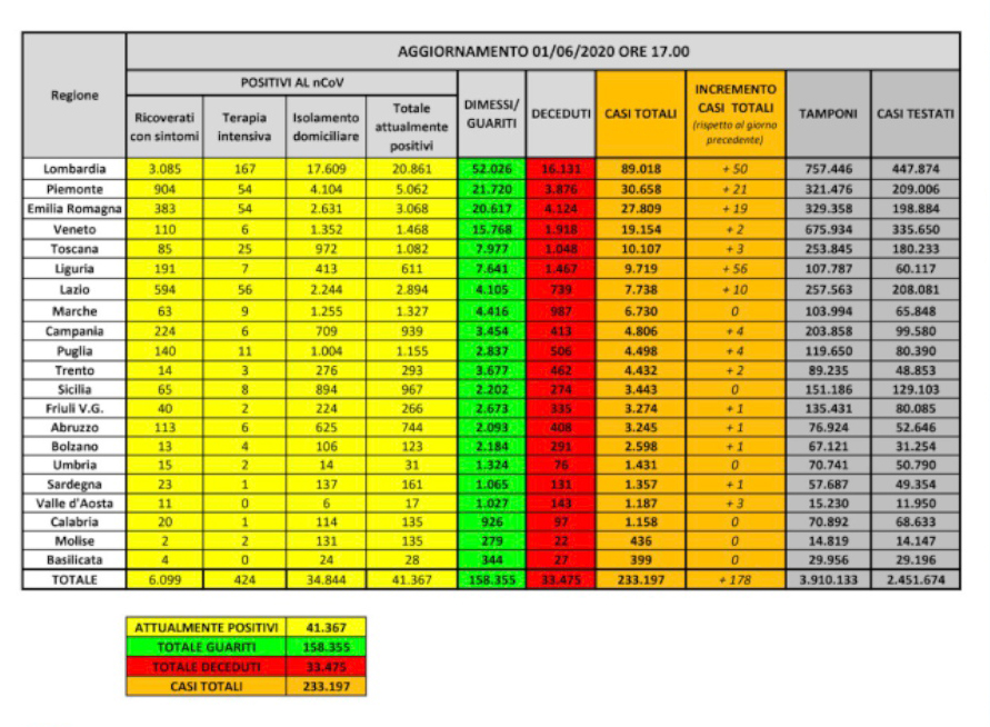 Un buon segnale che si aggiunge a quello dell’altro report mattutino che ha segnalato zero tamponi positivi tra quelli effettuati nelle ultime ore. In Italia, invece, nella giornata di oggi i decessi collegati al Covid 19 hanno toccato in totale quota 33.475 (+60 rispetto a ieri) su 233.197 contagi complessivi dall’inizio dell’emergenza sanitaria (i pazienti positivi attuali sono 41.367, +178 rispetto a ieri) e contro i 58.355 guariti (+848 rispetto a ieri).