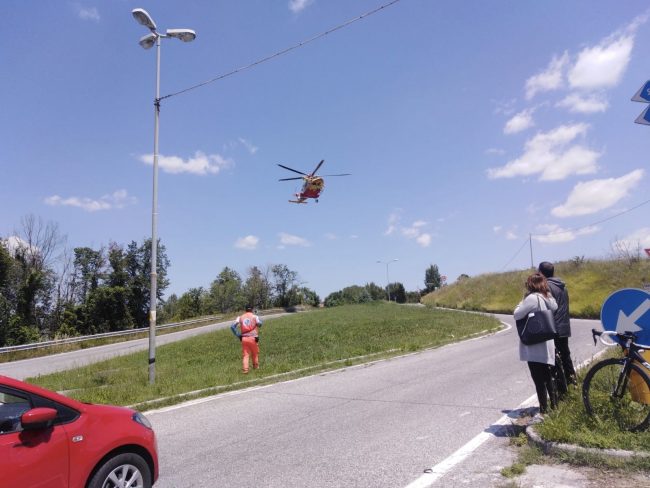 Un violento scontro tra una bici e una macchina si è verificato oggi verso le 13 all’incrocio tra la Sp362 e via Torre, incrocio per Santa Maria Nuova. Un uomo di 55 anni (M.R.le sue iniziali) mentre pedalava in sella alla sua bicicletta in direzione Filottrano-Jesi, si è scontrato per cause in corso di accertamento da parte dei carabinieri, con una utilitaria condotta da una donna che invece proveniva da via Minonna, da Jesi e stava svoltando verso sinistra per andare a Santa Maria Nuova. Uno scontro violentissimo in seguito al quale il ciclista ha divelto il finestrino laterale della vettura, finendo rovinosamente a terra. La donna, sotto choc, ha lanciato l’allarme al 118. Sul posto sono intervenuti l’automedica del 118 di Jesi, l’ambulanza della Croce verde di Jesi e i carabinieri. Data la dinamica maggiore del sinistro e la gravità delle condizioni dell’uomo, dalla centrale operativa di Ancona è stata anche inviata l’eliambulanza Icaro01 da Torrette che ha trasportato il ferito al pronto soccorso dell’ospedale regionale con un codice rosso. Nell’incidente ha riportato un trauma cranico commotivo e diverse contusioni. Era rimasto sempre cosciente, per fortuna, anche se non ricordava nulla della dinamica. Illesa la conducente della vettura. I carabinieri hanno condotto i rilievi di legge e dovranno ricostruire la dinamica del sinistro e le responsabilità.