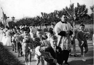Una processione guidata da don Sisinio Moretti negli anni ’60