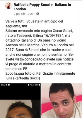 «Stiamo cercando mio cugino Oscar Socci, nato a Tessenei, Eritrea 16 settembre 1984; ma cittadino italiano di un paesino vicino Ancona nelle Marche. Venuto a Londra nel 2017. Sono 4/5 mesi che la madre e cosi anche noi cugine che non lo sentiamo. Se l’avete visto/conosciuto o avete sue notizie vi prego di aiutarlo a mettersi in contatto con me su Fb. Ecco la sua foto». Raffaella Socci è la cugina di Oscar, 35enne di Offagna che da 3 anni alla ricerca di un lavoro si è trasferito nella capitale del Regno Unito dove lei stessa vive. E proprio lei, a nome della famiglia, ha lanciato un appello sui social media per rintracciarlo.