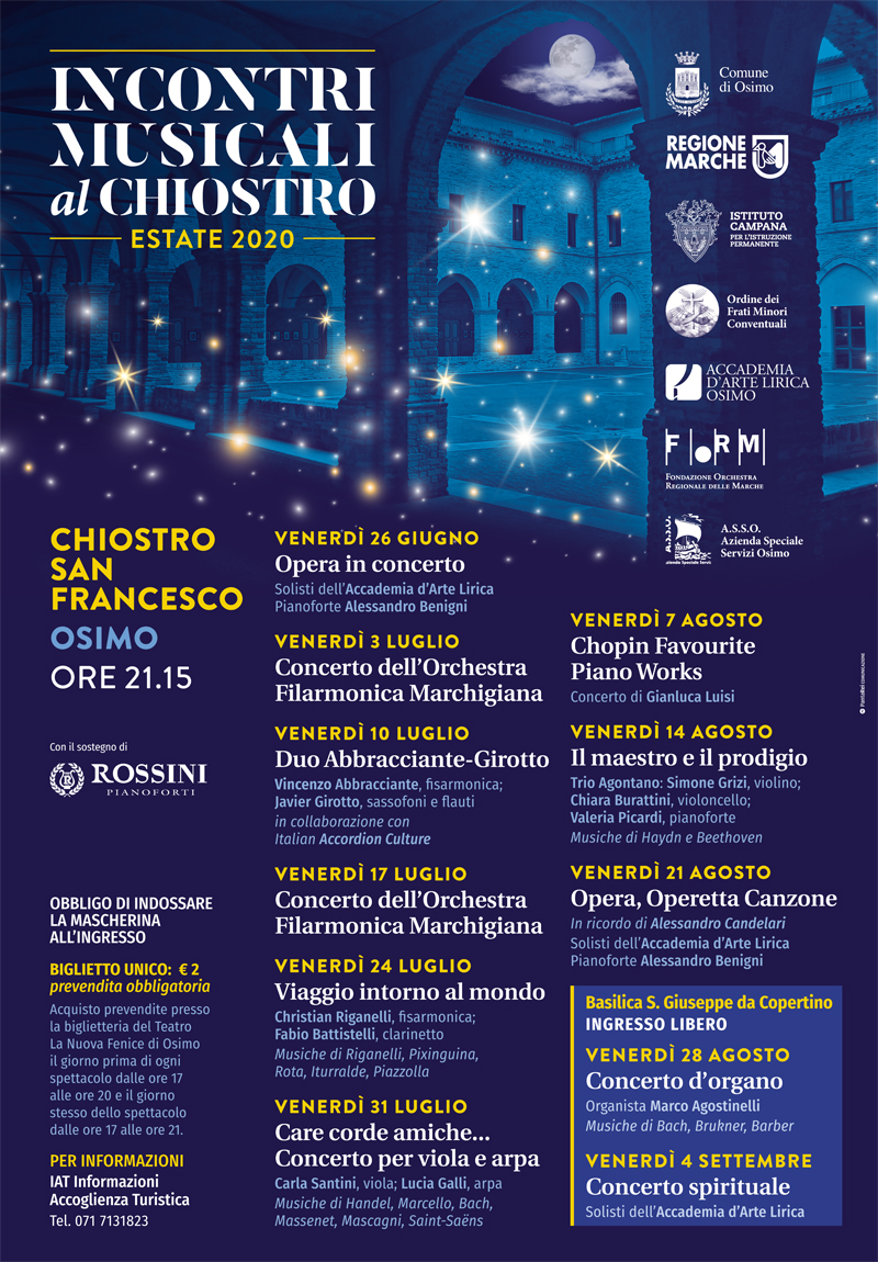 Sarà il Chiostro di San Francesco, grazie all’ospitalità dell’Ordine dei Frati Minori Conventuali, quest’anno ad accogliere ogni venerdì, dal 26 giugno al 4 settembre, la storica rassegna “Incontri musicali al Chiostro” promossa congiuntamente dal Comune di Osimo, dall’Istituto Campana per l’Istruzione Permanente, dall’Accademia di Arte Lirica, dalla Form-Fondazione Orchestra Regionale delle Marche, in collaborazione con l’Azienda Speciale Asso. «Uniti dalla volontà di offrire alla città una proposta culturale di alto livello nonostante le difficoltà del periodo, gli enti, che tradizionalmente organizzano i concerti nella città durante la stagione estiva, hanno voluto dare vita ad unico palinsesto che prevede ben 11 appuntamenti.- fa sapere una nota stampa del Comune di Osimo – Sarà l’Accademia d’Arte Lirica venerdì 26 giugno alle ore 21.15 ad inaugurare la rassegna con Opera in concerto che vede protagonisti i giovani solisti con al pianoforte Alessandro Benigni e che proseguirà il 21 agosto con il concerto in ricordo di Alessandro Candelari Opera, Operetta, Canzone. Si proseguirà venerdì 3 luglio con il concerto dell’Orchestra Filarmonica Marchigiana, impegnata anche nella serata del 17 luglio». L’Istituto Campana per l’Istruzione Permanente curerà i concerti del 24 luglio (Viaggio intorno al mondo con Riganelli, fisarmonica e Battistelli, clarinetto), del 31 luglio (Concerto per arpa e viola con Lucia Galli e Carla Santini) e del 7 agosto che vedrà protagonista il pianista Gianluca Luisi, proseguendo l’ormai storica collaborazione con la Nuova Coppa Pianisti. Per la serata del 14 agosto saranno protagoniste le musiche di Haydn e Beethoven nel concerto Il maestro e il prodigio del Trio Agontano. La rassegna chiuderà con due appuntamenti ad ingresso libero nella Basilica di San Giuseppe da Copertino: il Concerto d’organo (28 agosto) e il Concerto spirituale (4 settembre).