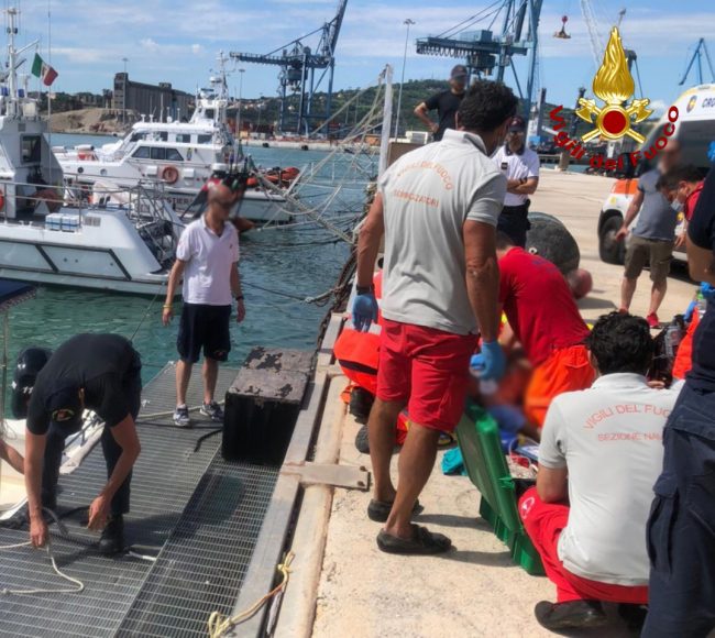 I sommozzatori dei vigili del fuoco di Ancona sono intervenuti stamattina alle 10.30 circa, su richiesta della Guardia Costiera, per soccorrere un diportista di 74 anni trovato a bordo di su una piccola imbarcazione incagliata sugli scogli della diga faranea, poco fuori dal porto di Ancona. All’arrivo dei soccorsi l’uomo era svenuto e privo di coscienza, come se avesse accusato un malore prima di perdere il controllo dell’imbarcazione. i vigili del fuoco gli hanno praticato subito le manovre di rianimazione durante il tragitto sul gommone fino alla banchine e poi, una volta a terra, hanno utilizzato il defibrillatore per i primi soccorsi in collaborazione con gli operatori sanitari del 118 e della Croce Gialla. L’anziano è stato poi trasportato in codice rosso al pronto soccorso dell’ospedale di Torrette.