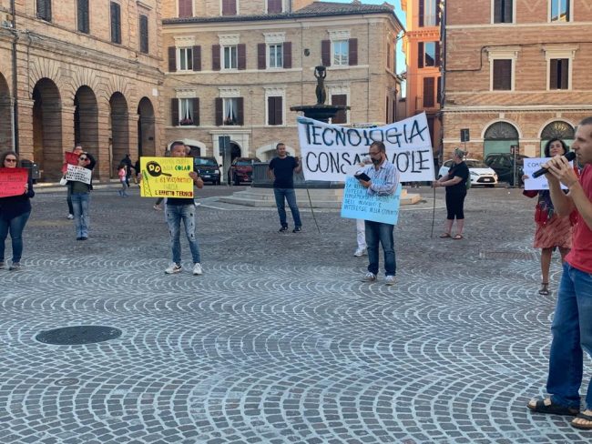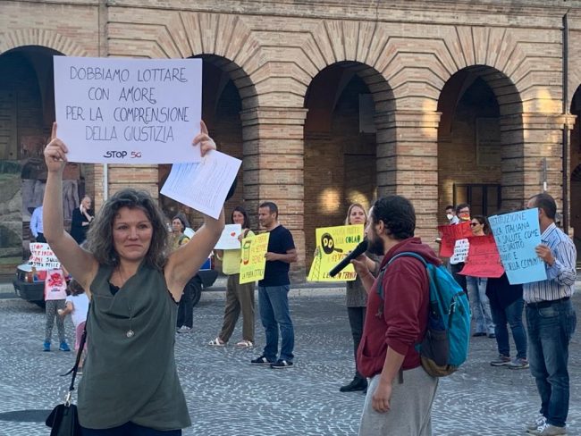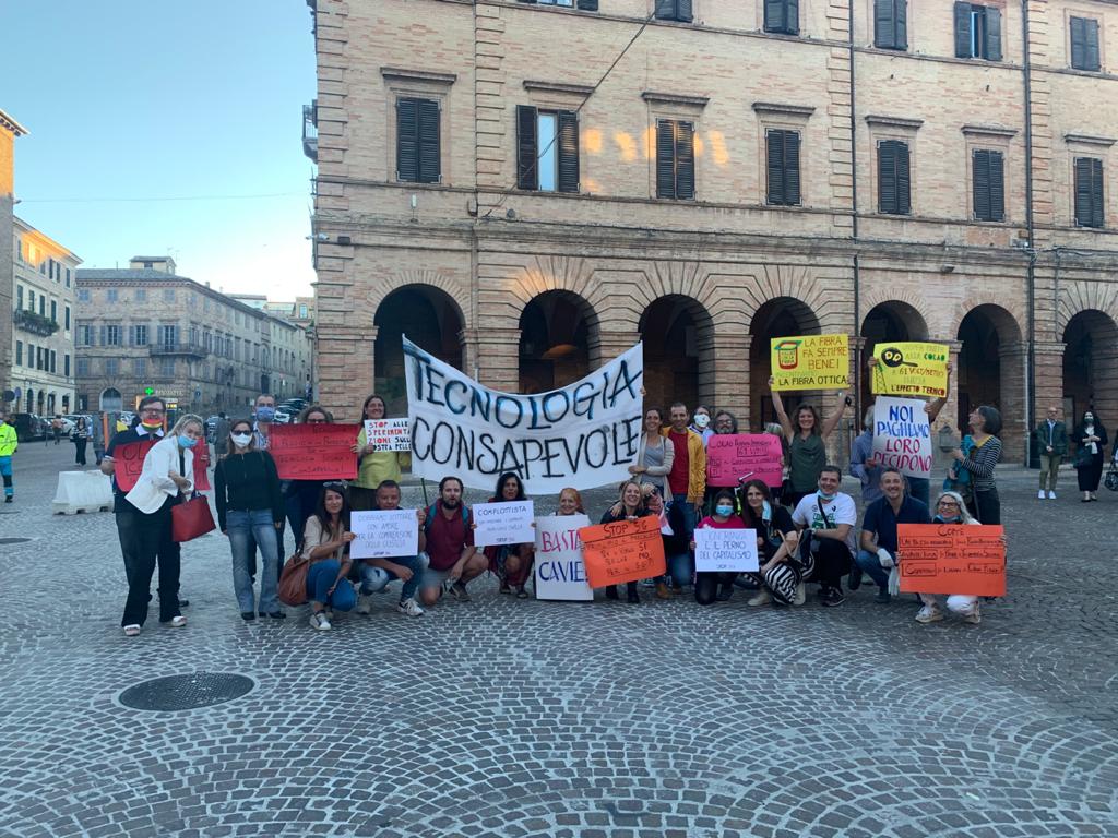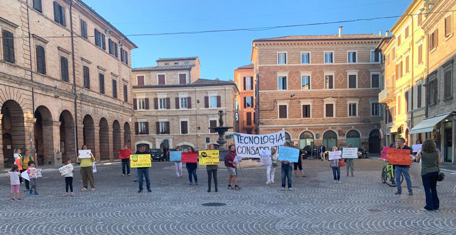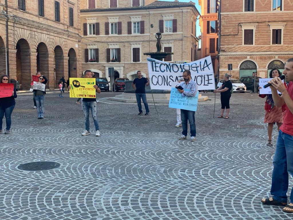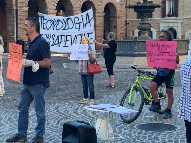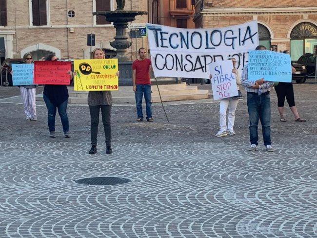 La manifestazione, unica nella regione Marche, si è svolta dalle 18.30 alle 20.30 con la finalità di promuovere una tecnologia sicura e consapevole e si è tenuta in concomitanza con altri eventi analoghi svoltisi in tutte le piazze d’Italia per denunciare i pericoli contenuti nel dossier “Iniziative per il rilancio – Italia 2020-2022”, redatto per il Governo Conte dal Comitato di esperti in materia economica e sociale guidato da Vittorio Colao. Il documento tecnico contiene una serie di richieste, in base alle quali,«se fossero adottate, la popolazione verrebbe irradiata senza soluzione di continuità fino a 61 V/m di campo elettrico emesso potenzialmente da milioni di nuove antenne per una sommatoria multipla e cumulativa di radiofrequenze da onde non ionizzanti» spiega una nota ufficiale.
