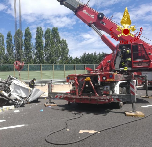 Tamponamento in A14 tra mezzi pesanti, un autista resta incastrato tra le lamiere e viene estratto dai vigili del fuoco di Ancona e Osimo. L’uomo, un 60enne di Camerano, si trova ora ricoverato all’ospedale di Torrette dove è stato trasferito in gravi condizioni con l’eliambulanza. L’incidente stradale è avvenuto nel primo pomeriggio di oggi, alle 13,15 circa, a pochi chilometri dall’ingresso del casello di Ancona Sud-Osimo, sul territorio di Camerano (al km. 232) e sulla corsia che corre verso Loreto. Per cause in fase di accertamento un autocarro di una ditta della grande distribuzione organizzata che trasportava generi alimentari ha tamponato un altro veicolo pesante, un autoarticolato. Nell’impatto il mezzo che ha tamponato ha perso sull’asfalto parte del carico. La squadra dei vigili del fuoco di Ancona è intervenuta sul posto con un’autobotte, un mezzo 4×4 e l’autogrù, coadiuvata nelle operazioni di messa in sicurezza dei mezzi e rimozione degli stessi dalla squadra dei colleghi del distaccamento di Osimo confluiti sul posto con un’altra autobotte. I pompieri hanno collaborato con i sanitari del 118 per estrarre l’autista rimasto incastrato nella cabina del mezzo che trasportava generi alimentari. Sul posto è atterrata anche l’eliambulanza per il trasferimento del ferito all’ospedale di Torrette, e ha operato la Polizia stradale per i rilievi di legge. I vigili del fuoco al momento si stanno ancora adoperando per la messa in sicurezza della zona dell’intervento e la circolazione viene fatta scorrere su una sola corsia di marcia e si sono registrati fino a due chilometri di incolonnamento di veicoli tra i caselli di Ancona Sud e Loreto-Porto Recanati.