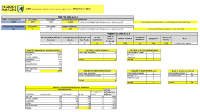 Per quanto riguarda i ricoverati, sono 11 nelle Marche: nessuno in terapia intensiva, due in post acuzie. Sono invece 748 le persone in quarantena nelle Marche, i dimessi e guariti sono 5.314.
