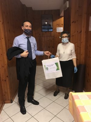 Suor Settimia della mensa di Padre Guido riceve la bag della Farmacia Vallemiano