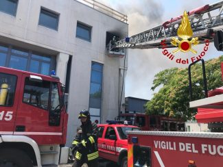 Un vasto incendio è scoppiato verso le 12,10 sul tetto di un edificio commerciale in via Abbagnano al civico 3 dove in quel momento si trovava a lavoro una ditta edile per applicare una copertura con guaina catramata al tetto. Per cause in corso di accertamento da parte dei Vigili del fuoco e dei Carabinieri, che in questi minuti si trovano sul posto ancora impegnati per l’intervento, la guaina avrebbe preso fuoco e un denso fumo nero si è propagato dal tetto fino agli uffici sottostanti. La struttura commerciale al civico 3 infatti, ospita sia il negozio “Tigotà” che dei locali adibiti a uffici di professionisti. Proprio da chi si trovava a lavoro negli uffici è scattato l’allarme al 115. In pochi istanti l’edificio è stato evacuato e sul posto sono intervenuti i vigili del fuoco con sei automezzi (due dal distaccamento di Senigallia più l’autoscala, l’autobotte e l’Aps dal comando di Ancona e un mezzo Nbrc per il cambio delle bombole) con un totale di 17 pompieri e il funzionario. L’incendio ha assunto dimensioni vastissime, per fortuna al momento sembra che non vi siano feriti o intossicati, tutte le persone che si trovavano nello stabile sono riuscite a mettersi in salvo giusto in tempo. L’intervento è ancora in corso. Sul posto anche i Carabinieri della Compagnia di Senigallia con il comandante del Norm tenente Claudio Fiori a monitorare personalmente la situazione.