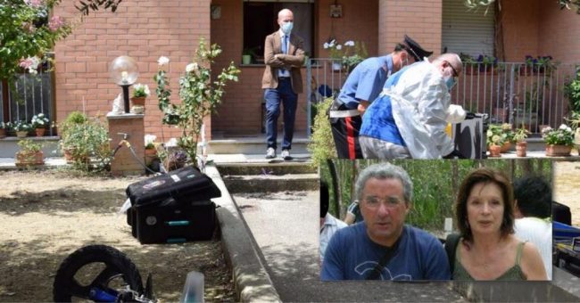 I rilievi dei carabinieri e nel riquadro Italo Giuliani e la moglie Fiorella Scarponi