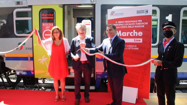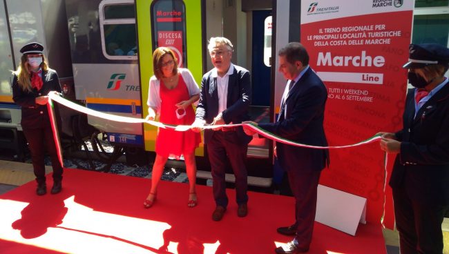 «Anche quest’anno – ha detto Fausto del Rosso, direttore regionale Marche di Trenitalia – riproponiamo il Marche Line, reduci dell’esperienza dello scorso anno. Nel 2019 siamo partiti nei weekend estivi di luglio e agosto e abbiamo visto infatti che è stata una formula apprezzata per la sua comodità, la sua sicurezza, il suo comfort e la sua economicità. Comunque sia – ha aggiunto – con la possibilità di acquistare andata e ritorno con il 50% di sconto significa viaggiare da Piacenza a San Benedetto con 32 euro, andata e ritorno, quindi capite bene che è anche vantaggioso. Data anche la condizione di circolazione delle nostre autostrade in questo momento ovviamente non può che essere una possibilità di muoversi, di raggiungere le nostre località e spiagge in modo assolutamente confortevole». L’assessore regionale ai Trasporti, Angelo Sciapichetti, dopo aver effettuato il taglio del nastro, ha spiegato che «Teniamo a battesimo per il secondo anno consecutivo l’importantissimo servizio che collega l’Emilia Romagna alle Marche – ha detto – e consente un afflusso di turisti abbastanza consistente. E’ un servizio che nasce dalla collaborazione tra Regione Marche e Trenitalia – che in questi anni, e nei prossimi, ha portato al rinnovo di tutti i treni viaggianti lungo le tratte marchigiane. Un servizio importante – ha sottolineato – perché consente di venire nelle Marche in tranquillità, sicurezza, facilità e risparmiando».