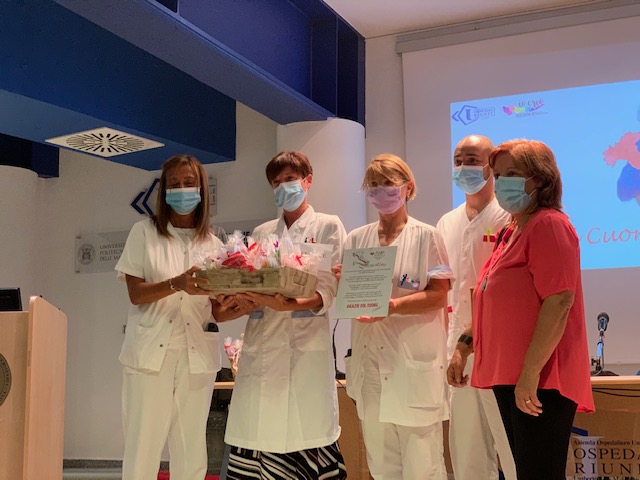Una cerimonia per omaggiare tutti quei operatori sanitari dei reparti coinvolti nell’emergenza Covid-19. E’ quella che si è svolta questa mattina all’auditorium Totti dell’ospedale regionale di Torrette. I camici bianchi sono stati premiati con dei cuori realizzati a mano dall’associazione “Grazie con il cuore” nata da un’idea di Antonella De Tomassi, che assieme a tante altre volontarie (tra le quali Laura Maurizi e Antonella Ricci) e la responsabile della Regione Marche Cinzia Menghini, hanno prodotto gli omaggi. A fare gli onori di casa il dg Michele Caporossi. Dopo un’introduzione della responsabile dell’Area delle Professioni Sanitarie – Area Infermieristica Ostetrica, Rosalia Mercanti, si è provveduto alla consegna dei cuori realizzati con materiali di tessuto, gesso, saponette, legno e cartoncino. Oltre al personale medico, paramedico, infermieristico, operatori socio sanitari protagonisti in prima linea in quei delicati giorni era presente anche il testimonial degli Ospedali Riuniti, Paolino Giampaoli, paziente 1 Covid-19 ad Ancona.