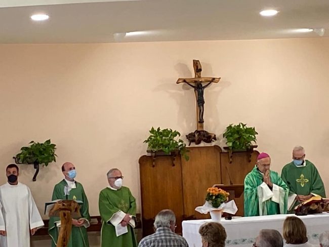 Un momento della messa di insediamento nella parrocchia di San Biagio di Osimo di don Michele Montebelli (secondo da sinistra)