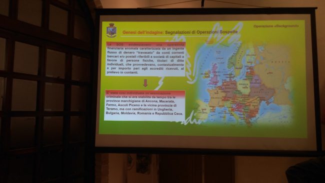 Dalle intercettazioni si sente uno dei membri dell’organizzazione chiedere al presunto dominus: «Tu stai portando avanti anche i finanziamenti del decreto?». E la risposta è stata: «Sì, stiamo lavorando mattina e sera su questo. Poi dopo io volevo fare la pratica perché lo sto facendo per tutte le aziende». Non solo, il timore di essere scoperti dalla Guardia di finanza non c’era. «La Finanza con me non ce la fa – emerge da un’altra intercettazione – perché ho 50 aziende, tutte collegate, tutto un miscuglio che per trovare una fessura ci vogliono 20 anni, capito». L’indagine, tuttora in corso, ha riguardato in parte il fallimento di 7 società, una delle quali ad Ancona. Fino ad oggi sono state 80 le intercettazione telefoniche effettuate, 12 quelle ambientali, 13 le geolocalizzazioni tramite gps, 120 gli accertamenti bancari con 300mila euro già sequestrati. «L’attività – ha spiegato il procuratore capo di Ancona Monica Garulli – ha consentito di evidenziare un’associazione per delinquere finalizzata fondamentalmente ad attività di riciclaggio. Il fenomeno intercettato è importante per estensione temporale e geografica e per il numero delle società coinvolte e ha evidenziato- ha aggiunto – anche un’ultima strumentalizzazione possibile dell’economia nell’attività legale nell’ambito dei finanziamenti garantiti dallo Stato. Nell’ambito di quelle attività di agevolazione per le attività in crisi infatti – ha concluso – anche questa associazione criminale intendeva avvalersi». L’organizzazione poteva inoltre avvalersi di una base operativa anche all’estero dove i profitti venivano fatti confluire in paesi quali Ungheria, Romania, Slovacchia, Bulgaria, Lituania, Moldavia e anche nel Delaware.