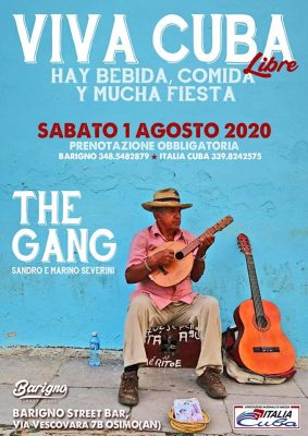 ‘Viva Cuba libre’ è una serata-evento organizzata da Barigno Street Bar di Osimo per sabato prossimo, 1 agosto,negli spazi di via Vescovara 7/b con raccolta fondi per i bambini di Cuba. Il ricavato della cena cubana sarà infatti devoluto all’ acquisto di farmaci antitumorali pediatrici (Actinomicina-D) da inviare a Cuba, ancora sotto embargo economico. La cena spettacolo “al Sabor Cubano” prevede un piatto unico con pietanze della cucina tipica cubana (costo di partecipazione 10 euro) con il concerto live di Sandro e Marino Severini (The Gang), cocktail cubani con mercatini. La prenotazione è obbligatoria e fa fissata entro giovedì prossimo, 30 luglio al 348.5482879 o al 339.8242575. La cucina sarà operativa dalle 19:30 e il programma della serata prevede il primo live di The Gang proprio alle 19.30 negli spazi del Barigno Street Bar, mentre per il secondo spettacolo, previsto per le 22, il concerto si sposterà nel vicino Skateparkosimo Ignopark.
